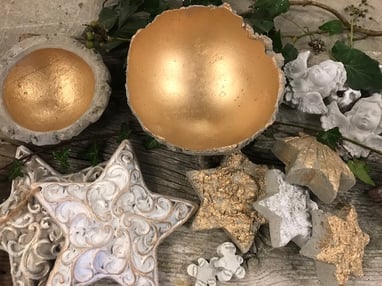 Sie giessen und modellieren verschiedene Objekte zum Thema Weihnacht und bemalen sie je nach Geschmack golden ,silbern oder kupfer.